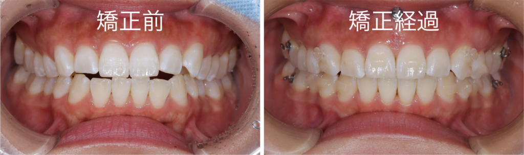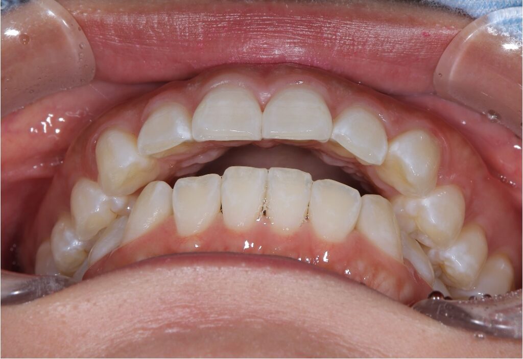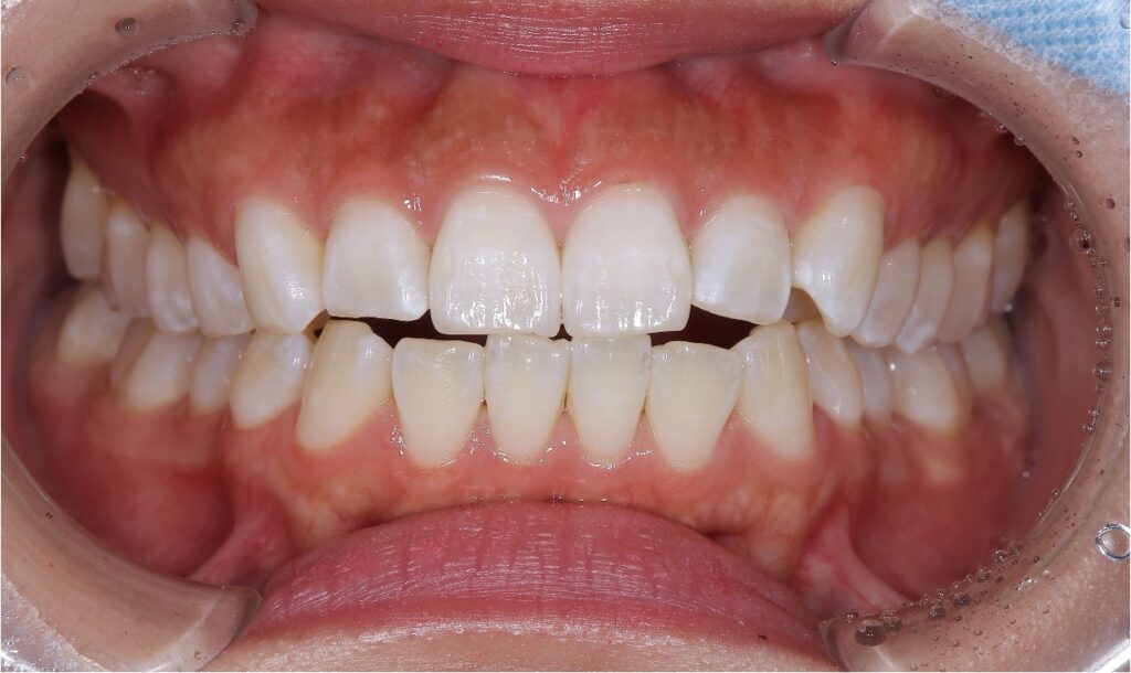 治療途中にはなりますが、非抜歯・マウスピース矯正により前歯がほとんど咬み合うところまで改善いたしました