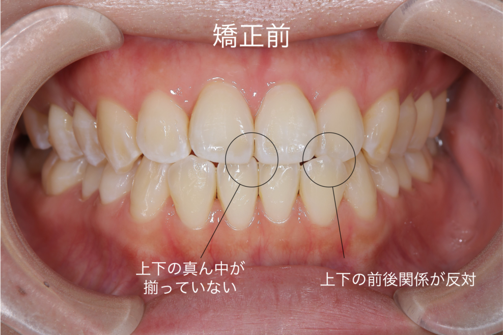 初診時の状態では、向かって右側の前歯が上下の前後関係が反対になっていました