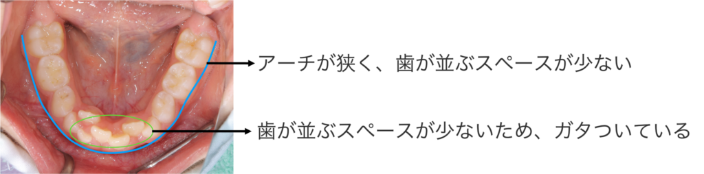 現状の評価と致しましては、下顎のアーチが狭く歯が並ぶスペースが少ないため、前歯がガタついていると判断いたしました