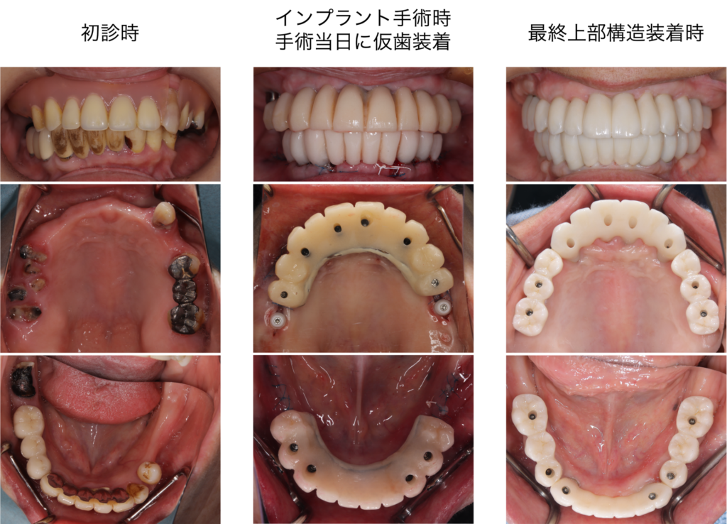 今回の症例では、インプラントを埋め込んだ当日にインプラントを土台とした歯を装着することができましたので、その後は取り外し式の義歯を使用することがなく、患者様にも大変喜んでいただけました